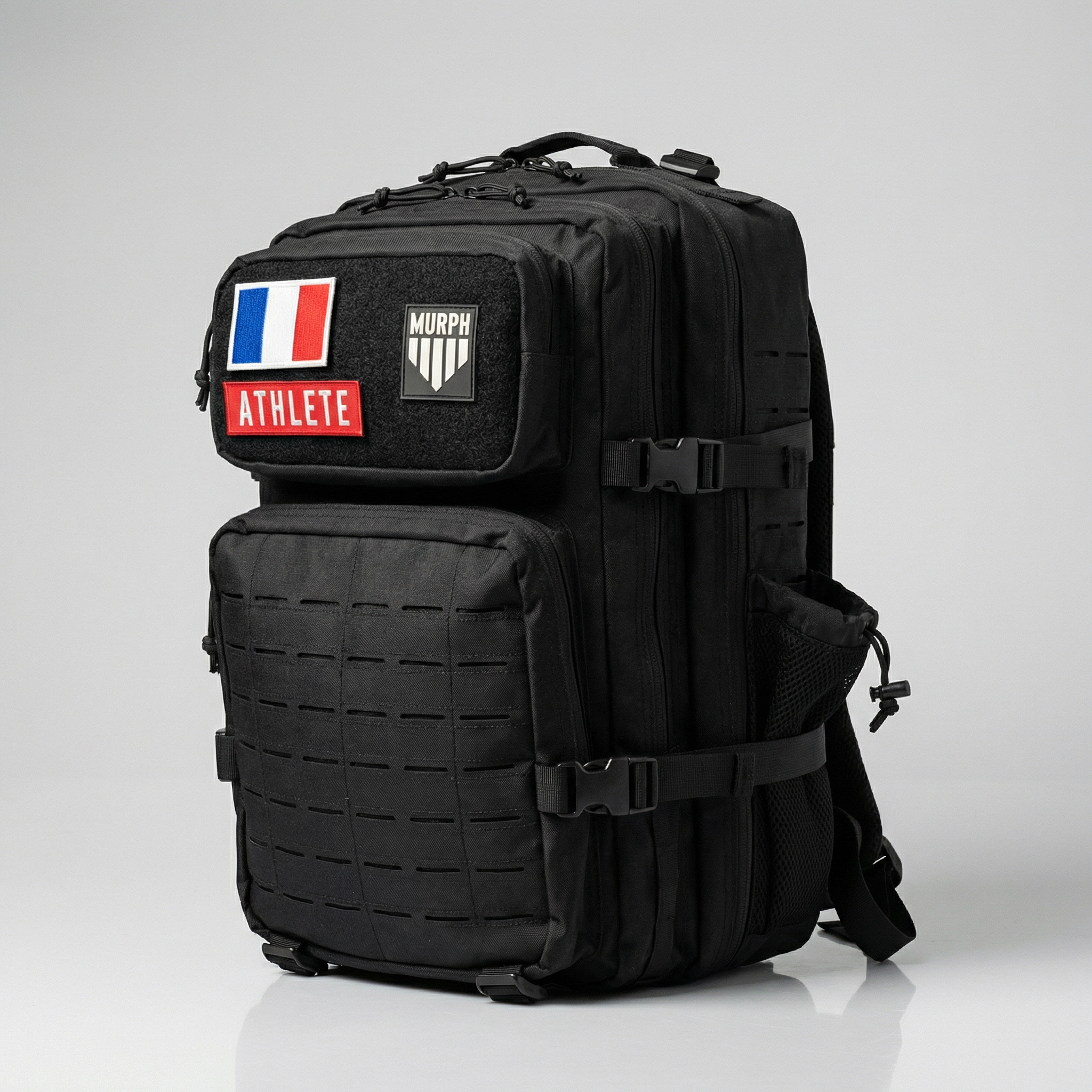 Le système MOLLE (Modular Lightweight Load-carrying Equipment) est le standard militaire de fixation modulaire. Sur nos sacs, il vous permet d'attacher des pochettes supplémentaires, une gourde, des mousquetons ou tout autre accessoire sur les sangles externes. En jour de compétition Hyrox, accrochez votre gourde et vos élastiques à l'extérieur. En jour de WOD classique, gardez un setup minimaliste. Votre sac tactique sport s'adapte à chaque session.